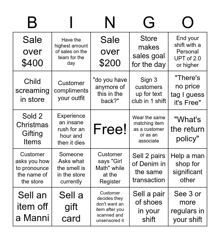 This bingo card has a free space and 24 words: Someone Asks what the smell is in the store currently, Sell a gift card, "do you have anymore of this in the back?", Sell an item off a Manni, End your shift with a Personal UPT of 2.0 or higher, Sale over $400, Child screaming in store, Have the highest amount of sales on the team for the day, Wear the same matching item as a customer or as an associate, Customer says "Girl Math" while at the Register, Sign 3 customers up for text club in 1 shift, Sold 2 Christmas Gifting Items, Sell 2 pairs of Denim in the same transaction, Help a man shop for significant other, Customer compliments your outfit, Sell a pair of shoes in your shift, "What's the return policy", Sale over $200, "There's no price tag I guess it's Free", Experience an insane rush for an hour and then it dies, See 3 or more regulars in your shift, Customer asks you how to pronounce the name of the store, Store makes sales goal for the day and Customer decides they don't want an item after you scanned and unsensored it.