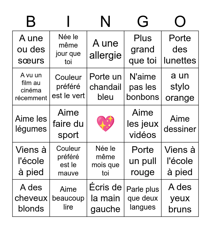 This bingo card has a free space and 29 words: A des cheveux blonds, A un ou des frères, Aime faire du sport, A un chat, A une ou des sœurs, A une allergie, Couleur préféré est le vert, Couleur préféré est le mauve, Aime les jeux vidéos, Aime beaucoup lire, Aime dessiner, A des yeux bruns, Écris de la main gauche, Parle plus que deux langues, a un stylo orange, porte une robe, Née le même mois que toi, Viens à l'école à pied, Porte des lunettes, Aime les légumes, Porte un pull rouge, Parti en vacances cet été, N'aime pas les bonbons, A vu un film au cinéma récemment, Plus grand que toi, Née le même jour que toi, Viens à l'école à pied, Porte un chandail bleu and A un chien.
