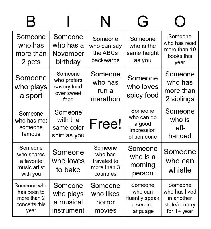 This bingo card has a free space and 26 words: Someone who has traveled to more than 3 countries, Someone who can fluently speak a second language, Someone who has run a marathon, Someone who plays a musical instrument, Someone who has read more than 10 books this year, Someone who has more than 2 pets, Someone who plays a sport, Someone who has a November birthday, Someone who is left-handed, Someone who is a morning person, Someone who loves spicy food, Someone who has met someone famous, Someone who can whistle, Someone who has been to more than 2 concerts this year, Someone with the same color shirt as you, Someone in the same BECK discipline as you, Someone who is the same height as you, Someone who shares a favorite music artist with you, Someone who can say the ABCs backwards, Someone who has lived in another state/country for 1+ year, Someone who has more than 2 siblings, Someone who likes horror movies, Someone who can do a good impression of someone, Someone who loves to bake, Someone who prefers savory food over sweet food and Someone who is a collector (of anything!).
