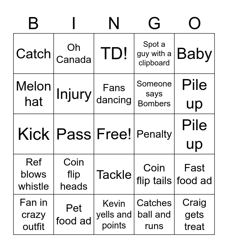 This bingo card has a free space and 24 words: Coin flip heads, Pet food ad, Fans dancing, Fan in crazy outfit, Baby, Catch, Melon hat, Oh Canada, Penalty, Tackle, Someone says Bombers, Kick, Coin flip tails, Fast food ad, Injury, Catches ball and runs, Pile up, TD!, Pile up, Pass, Craig gets treat, Ref blows whistle, Spot a guy with a clipboard and Kevin yells and points.