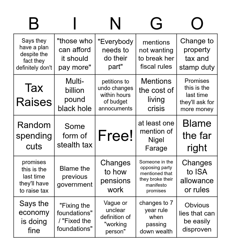 This bingo card has a free space and 24 words: Blame the previous government, "Fixing the foundations" / "Fixed the foundations", petitions to undo changes within hours of budget annocuments, Says the economy is doing fine, Change to property tax and stamp duty, Says they have a plan despite the fact they definitely don't, Tax Raises, "those who can afford it should pay more", at least one mention of Nigel Farage, Changes to how pensions work, Mentions the cost of living crisis, Random spending cuts, Someone in the opposing party mentioned that they broke their manifesto promises, Changes to ISA allowance or rules, Multi- billion pound black hole, changes to 7 year rule when passing down wealth, Blame the far right, "Everybody needs to do their part", Promises this is the last time they'll ask for more money, Some form of stealth tax, Obvious lies that can be easily disproven, promises this is the last time they'll have to raise tax, mentions not wanting to break her fiscal rules and Vague or unclear definition of "working person".