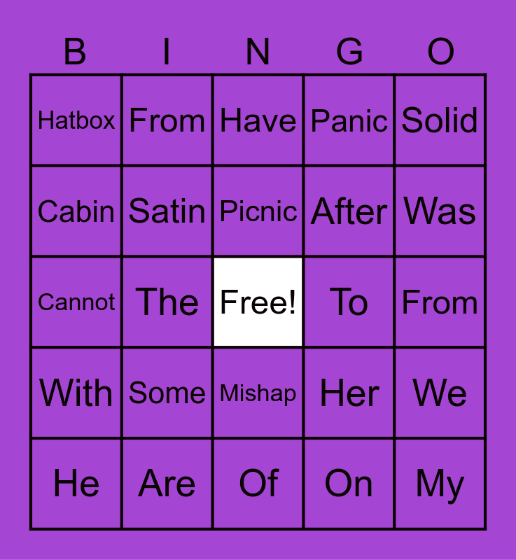 This bingo card has a free space and 35 words: Rabbit, Limit, Valid, Satin, Mishap, Panic, Cabin, Napkin, Picnic, Zigzag, Cannot, Solid, Bobcat, Visit, Hatbox, To, On, The, With, My, Her, He, We, Are, Have, Was, No, Go, After, From, You, Of, Some, From and Put.