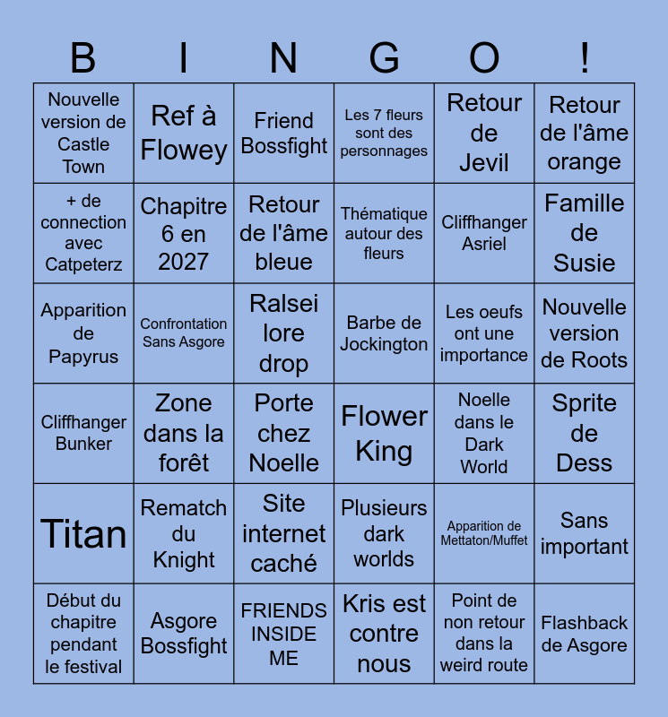 This bingo card has 36 words: Plusieurs dark worlds, Site internet caché, Kris est contre nous, + de connection avec Catpeterz, Cliffhanger Bunker, Barbe de Jockington, Chapitre 6 en 2027, FRIENDS INSIDE ME, Retour de Jevil, Apparition de Mettaton/Muffet, Famille de Susie, Les 7 fleurs sont des personnages, Sans important, Confrontation Sans Asgore, Thématique autour des fleurs, Nouvelle version de Castle Town, Titan, Les oeufs ont une importance, Apparition de Papyrus, Friend Bossfight, Ralsei lore drop, Zone dans la forêt, Flower King, Porte chez Noelle, Noelle dans le Dark World, Ref à Flowey, Cliffhanger Asriel, Asgore Bossfight, Retour de l'âme bleue, Retour de l'âme orange, Flashback de Asgore, Début du chapitre pendant le festival, Sprite de Dess, Nouvelle version de Roots, Rematch du Knight and Point de non retour dans la weird route.