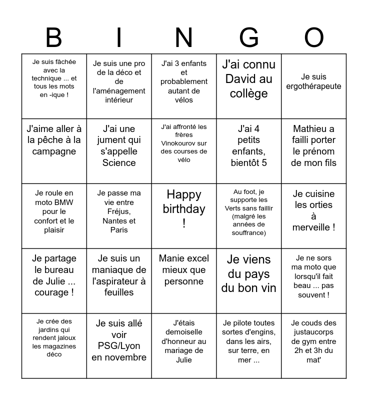 This bingo card has a free space and 24 words: Je suis un maniaque de l'aspirateur à feuilles, Je suis allé voir PSG/Lyon en novembre, J'ai affronté les frères Vinokourov sur des courses de vélo, Je crée des jardins qui rendent jaloux les magazines déco, Je suis ergothérapeute, Je suis fâchée avec la technique ... et tous les mots en -ique !, J'aime aller à la pêche à la campagne, Je suis une pro de la déco et de l'aménagement intérieur, Au foot, je supporte les Verts sans faillir (malgré les années de souffrance), Manie excel mieux que personne, J'ai 4 petits enfants, bientôt 5, Je roule en moto BMW pour le confort et le plaisir, Je viens du pays du bon vin, Je ne sors ma moto que lorsqu'il fait beau ... pas souvent !, J'ai une jument qui s'appelle Science, Je pilote toutes sortes d'engins, dans les airs, sur terre, en mer ..., Je cuisine les orties à merveille !, J'ai 3 enfants et probablement autant de vélos, Mathieu a failli porter le prénom de mon fils, Je passe ma vie entre Fréjus, Nantes et Paris, Je couds des justaucorps de gym entre 2h et 3h du mat', Je partage le bureau de Julie ... courage !, J'ai connu David au collège and J'étais demoiselle d'honneur au mariage de Julie.