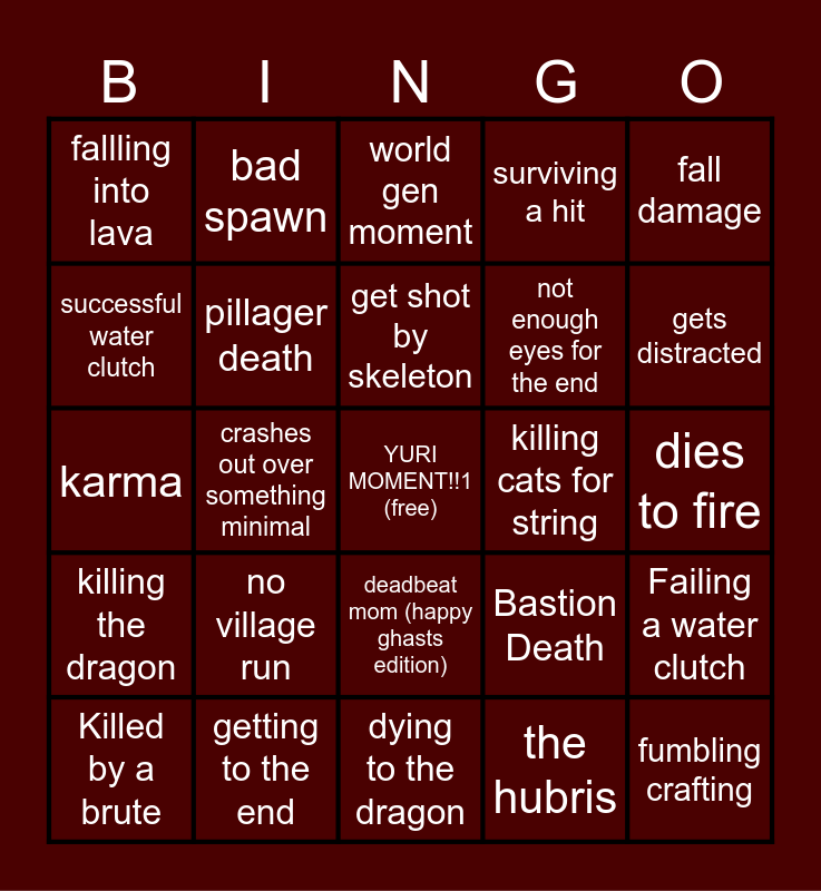 This bingo card has a free space and 24 words: Killed by a brute, no village run, get shot by skeleton, the hubris, fall damage, fallling into lava, bad spawn, world gen moment, killing cats for string, dies to fire, karma, pillager death, Bastion Death, Failing a water clutch, successful water clutch, getting to the end, dying to the dragon, surviving a hit, gets distracted, killing the dragon, crashes out over something minimal, deadbeat mom (happy ghasts edition), not enough eyes for the end and fumbling crafting.