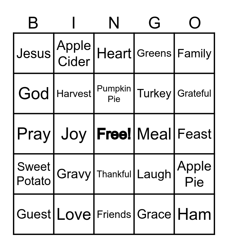 This bingo card has a free space and 24 words: Gravy, Love, Pumpkin Pie, Guest, Family, Jesus, God, Apple Cider, Meal, Thankful, Turkey, Pray, Laugh, Apple Pie, Harvest, Grace, Feast, Heart, Grateful, Joy, Ham, Sweet Potato, Greens and Friends.