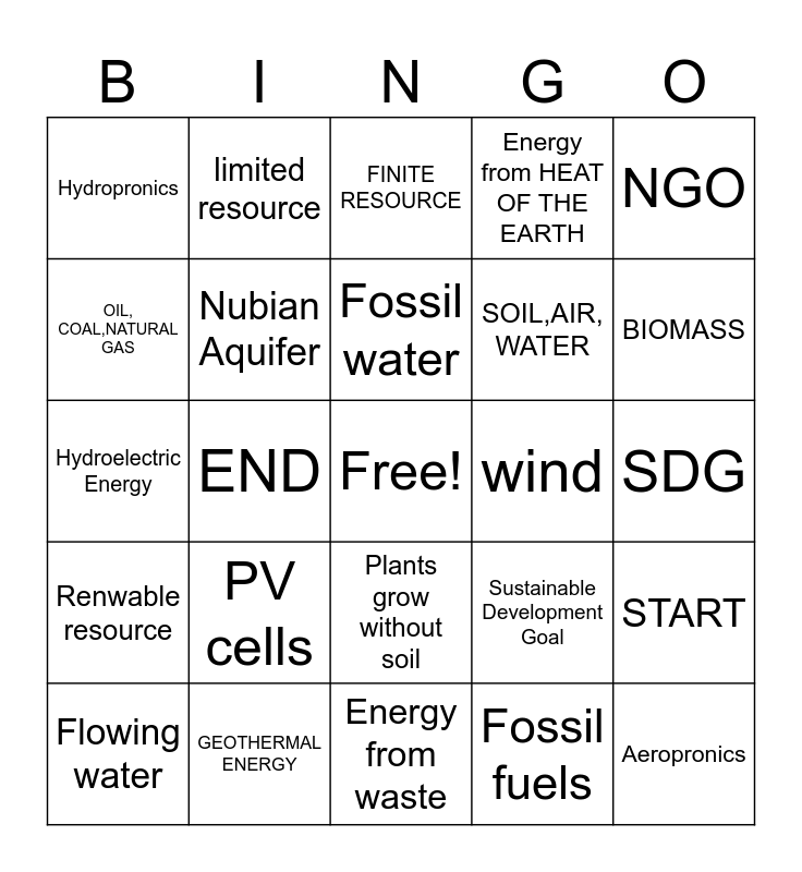This bingo card has a free space and 28 words: START, Natural resource, SOIL,AIR, WATER, Fossil fuels, OIL, COAL,NATURAL GAS, FINITE RESOURCE, limited resource, Renwable resource, wind, Flowing water, Hydroelectric Energy, Energy from HEAT OF THE EARTH, GEOTHERMAL ENERGY, Energy from waste, BIOMASS, Solar Energy, PV cells, Nubian Aquifer, Fossil water, Plants grow without soil, Hydropronics, Plants grow without air, Aeropronics, END, SDG, Sustainable Development Goal, NGO and Non Government Organization.