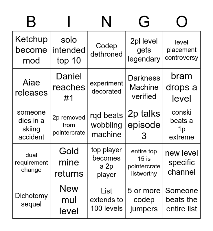 This bingo card has a free space and 24 words: Dichotomy sequel, Gold mine returns, experiment decorated, 5 or more codep jumpers, level placement controversy, Ketchup become mod, solo intended top 10, Codep dethroned, 2p talks episode 3, conski beats a 1p extreme, someone dies in a skiing accident, Daniel reaches #1, entire top 15 is pointercrate listworthy, new level specific channel, Aiae releases, New mul level, List extends to 100 levels, 2pl level gets legendary, bram drops a level, dual requirement change, 2p removed from pointercrate, top player becomes a 2p player, Darkness Machine verified and Someone beats the entire list.