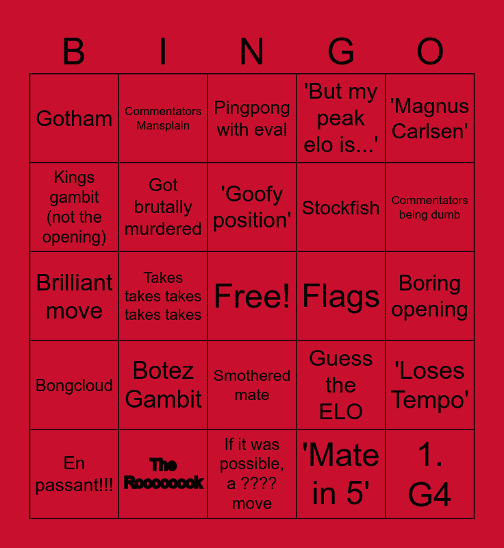This bingo card has a free space and 24 words: Botez Gambit, The Roooooook, 'Goofy position', En passant!!!, 'Magnus Carlsen', Gotham, Kings gambit (not the opening), Commentators Mansplain, Flags, Smothered mate, Stockfish, Brilliant move, Guess the ELO, 'Loses Tempo', Got brutally murdered, 'Mate in 5', Boring opening, Pingpong with eval, Commentators being dumb, Takes takes takes takes takes, 1. G4, Bongcloud, 'But my peak elo is...' and If it was possible, a ???? move.