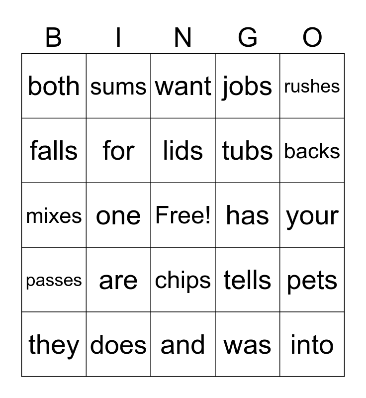 This bingo card has a free space and 29 words: they, have, one, from, both, want, for, are, has, does, your, into, and, was, backs, checks, chips, passes, rushes, mixes, tells, vans, tubs, falls, jobs, sums, pets, lids and mashes.