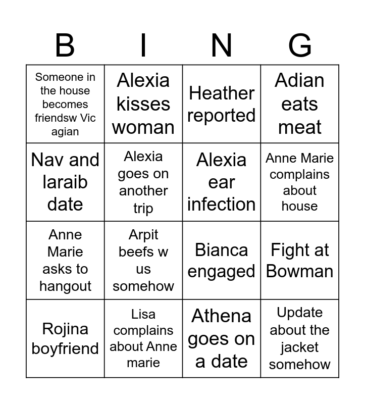This bingo card has 16 words: Lisa complains about Anne marie, Fight at Bowman, Heather reported, Someone in the house becomes friendsw Vic agian, Anne Marie asks to hangout, Alexia kisses woman, Bianca engaged, Athena goes on a date, Nav and laraib date, Alexia goes on another trip, Rojina boyfriend, Adian eats meat, Arpit beefs w us somehow, Anne Marie complains about house, Alexia ear infection and Update about the jacket somehow.
