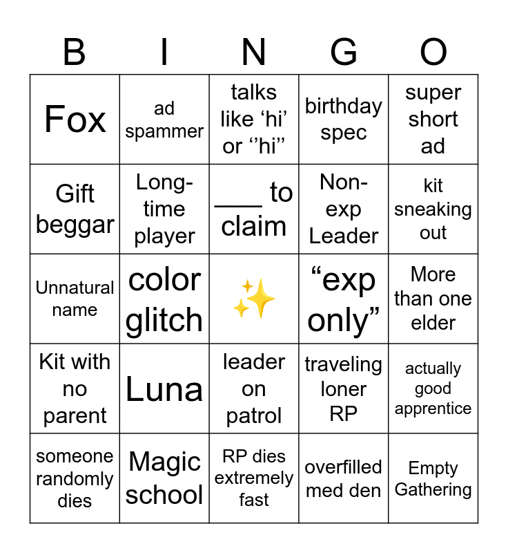 This bingo card has a free space and 24 words: Luna, Magic school, ___ to claim, someone randomly dies, super short ad, Fox, Gift beggar, ad spammer, “exp only”, leader on patrol, Non-exp Leader, Unnatural name, traveling loner RP, actually good apprentice, Long-time player, overfilled med den, More than one elder, talks like ‘hi’ or ‘’hi’’, kit sneaking out, color glitch, Empty Gathering, Kit with no parent, birthday spec and RP dies extremely fast.