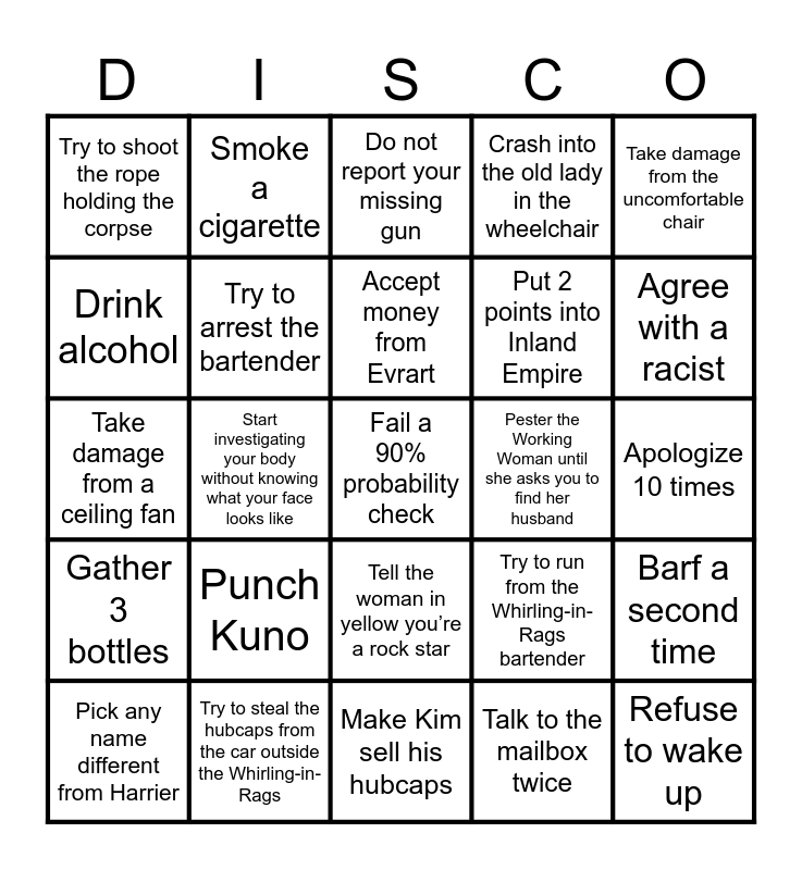 This bingo card has a free space and 24 words: Punch Kuno, Try to steal the hubcaps from the car outside the Whirling-in-Rags, Accept money from Evrart, Pick any name different from Harrier, Take damage from the uncomfortable chair, Try to shoot the rope holding the corpse, Drink alcohol, Smoke a cigarette, Pester the Working Woman until she asks you to find her husband, Tell the woman in yellow you’re a rock star, Put 2 points into Inland Empire, Take damage from a ceiling fan, Try to run from the Whirling-in-Rags bartender, Barf a second time, Try to arrest the bartender, Talk to the mailbox twice, Apologize 10 times, Do not report your missing gun, Agree with a racist, Start investigating your body without knowing what your face looks like, Refuse to wake up, Gather 3 bottles, Crash into the old lady in the wheelchair and Make Kim sell his hubcaps.