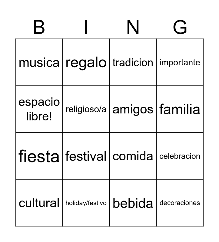 This bingo card has 16 words: holiday/festivo, celebracion, tradicion, musica, fiesta, regalo, comida, bebida, espacio libre!, religioso/a, cultural, importante, festival, familia, amigos and decoraciones.