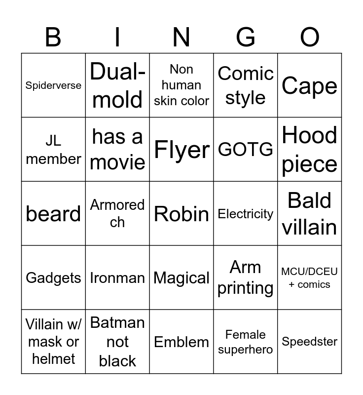This bingo card has a free space and 24 words: Ironman, Batman not black, Flyer, Villain w/ mask or helmet, Cape, Spiderverse, JL member, Dual-mold, Electricity, Magical, GOTG, beard, Arm printing, MCU/DCEU + comics, has a movie, Female superhero, Bald villain, Non human skin color, Hood piece, Armored ch, Speedster, Gadgets, Comic style and Emblem.