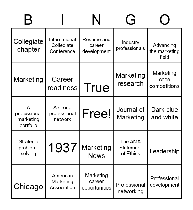 This bingo card has a free space and 24 words: 1937, American Marketing Association, True, Chicago, Advancing the marketing field, Collegiate chapter, Marketing, International Collegiate Conference, Journal of Marketing, Marketing News, Marketing research, A professional marketing portfolio, The AMA Statement of Ethics, Leadership, Career readiness, Professional networking, Dark blue and white, Resume and career development, Marketing case competitions, A strong professional network, Professional development, Strategic problem-solving, Industry professionals and Marketing career opportunities.