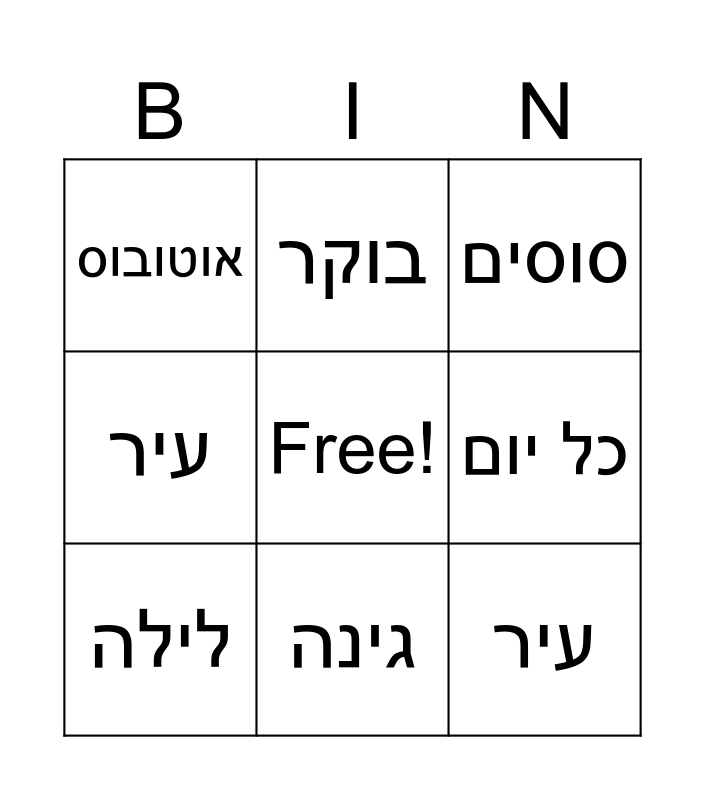 This bingo card has a free space and 15 words: בית, מושב, סוסים, אוטובוס, גינה, עיר, בית, בית ספר, כל יום, כפר יהושע, גינה, עיר, לילה, בוקר and שבת.