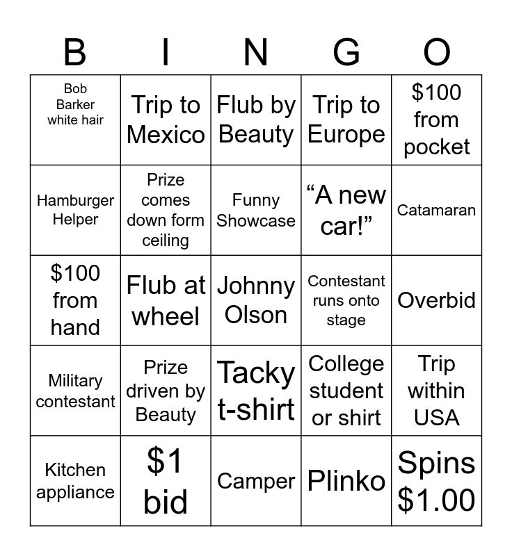This bingo card has a free space and 29 words: Kitchen appliance, Hamburger Helper, Flub at wheel, Bob Barker dark hair, Bob Barker white hair, Flub by Beauty, Prize comes down form ceiling, Prize driven by Beauty, Contestant runs onto stage, $1 bid, Overbid, Spins $1.00, Camper, Plinko, Catamaran, Range Game, Tacky t-shirt, Military contestant, $100 from pocket, $100 from hand, College student or shirt, Chandelier, “A new car!”, Hamburger Helper, Trip to Europe, Trip to Mexico, Trip within USA, Funny Showcase and Wins both showcase.