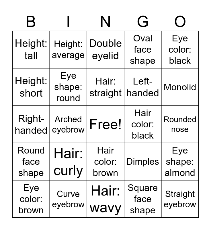 This bingo card has a free space and 25 words: Hair: curly, Hair: wavy, Hair: straight, Eye color: brown, Eye color: black, Height: tall, Height: short, Height: average, Hair color: black, Hair color: brown, Left-handed, Right-handed, Dimples, Eye shape: almond, Eye shape: round, Pointed nose, Rounded nose, Double eyelid, Monolid, Arched eyebrow, Straight eyebrow, Curve eyebrow, Round face shape, Oval face shape and Square face shape.