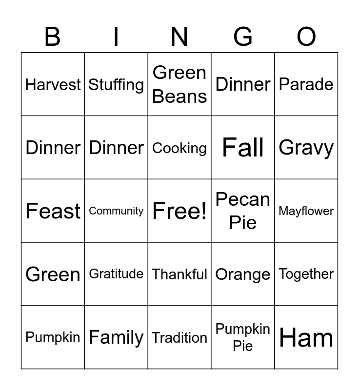 This bingo card has a free space and 43 words: Turkey, Ham, Leaf, Pumpkin, Sweater, Pumpkin Pie, Green Beans, Football, Parade, Family, Dinner, Pecan Pie, Thankful, Gratitude, Autumn, Tradition, Home, Feast, Holiday, Gravy, Stuffing, Cranberries, Sweet Potatoes, Harvest, Pilgrims, Mayflower, Cornucopia, Recipe, Orange, Green, Colonists, Together, Travel, Community, Bread, Voyage, Native American, Cooking, Dinner, Fall, Dishes, Dinner and Gobble Gobble.