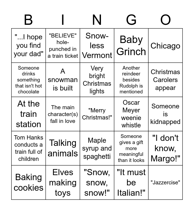 This bingo card has a free space and 24 words: Talking animals, Elves making toys, Very bright Christmas lights, Baking cookies, Chicago, "...I hope you find your dad", Someone drinks something that isn't hot chocolate, "BELIEVE" hole-punched in a train ticket, Oscar Meyer weenie whistle, Maple syrup and spaghetti, Another reindeer besides Rudolph is mentioned, At the train station, Someone gives a gift more meaningful than it looks, "I don't know, Margo!", A snowman is built, "It must be Italian!", Someone is kidnapped, Snow-less Vermont, Christmas Carolers appear, The main character(s) fall in love, "Jazzercise", Tom Hanks conducts a train full of children, Baby Grinch and "Snow, snow, snow!".