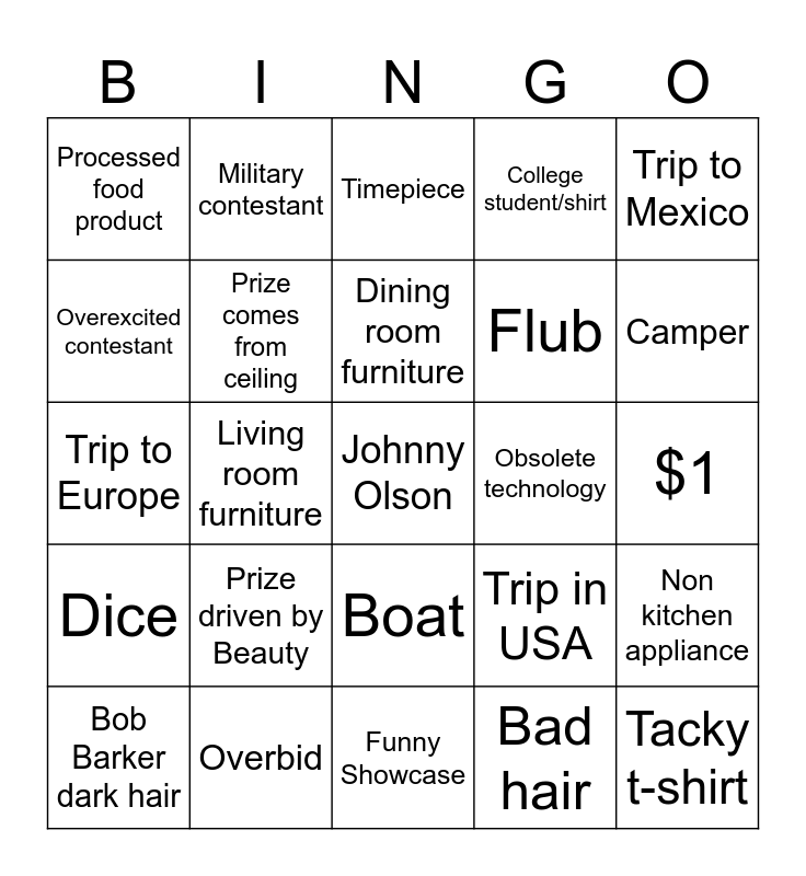 This bingo card has a free space and 29 words: Bob Barker dark hair, Bob Barker White hair, Living room furniture, Kitchen appliance, Processed food product, Timepiece, Prize comes from ceiling, Prize driven by Beauty, Obsolete technology, Overbid, $1, Tacky t-shirt, Funny Showcase, Bad hair, Camper, “A new car!”, Boat, Dice, Trip to Mexico, Trip to Europe, Trip in USA, Detergent or soap, Flub, Overexcited contestant, College student/shirt, Military contestant, Non kitchen appliance, Dining room furniture and Outdoor furniture.