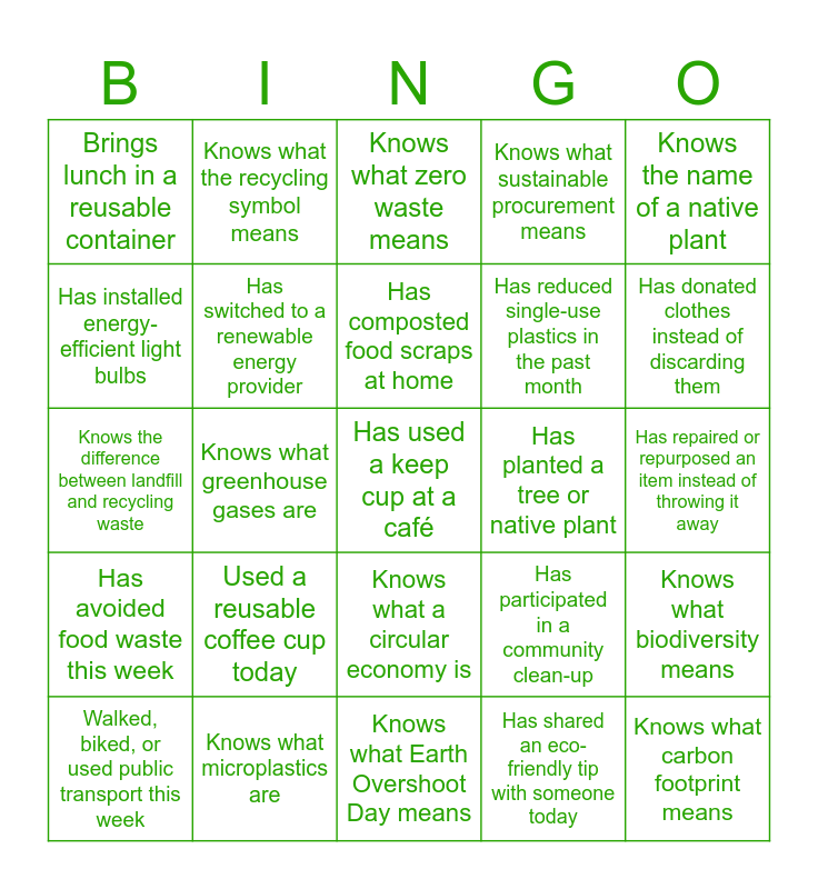 This bingo card has 25 words: Used a reusable coffee cup today, Knows what Earth Overshoot Day means, Has composted food scraps at home, Walked, biked, or used public transport this week, Knows the name of a native plant, Brings lunch in a reusable container, Has installed energy-efficient light bulbs, Knows what the recycling symbol means, Has planted a tree or native plant, Knows what a circular economy is, Has reduced single-use plastics in the past month, Knows the difference between landfill and recycling waste, Has participated in a community clean-up, Knows what biodiversity means, Has switched to a renewable energy provider, Knows what carbon footprint means, Has repaired or repurposed an item instead of throwing it away, Knows what zero waste means, Has donated clothes instead of discarding them, Knows what greenhouse gases are, Has used a keep cup at a café, Knows what microplastics are, Has avoided food waste this week, Knows what sustainable procurement means and Has shared an eco-friendly tip with someone today.
