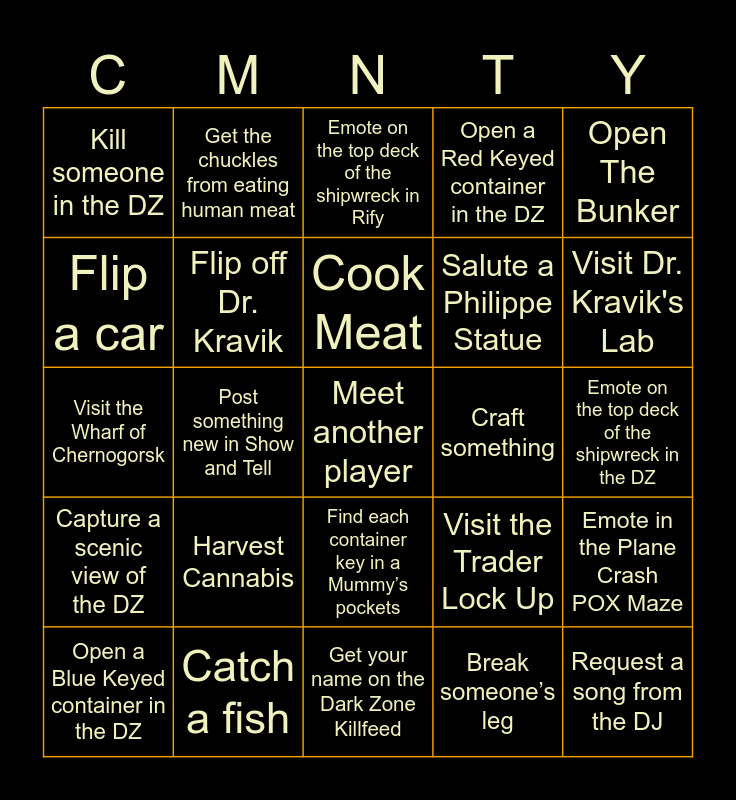 This bingo card has a free space and 24 words: Harvest Cannabis, Catch a fish, Cook Meat, Open a Blue Keyed container in the DZ, Open The Bunker, Kill someone in the DZ, Flip a car, Get the chuckles from eating human meat, Craft something, Find each container key in a Mummy’s pockets, Salute a Philippe Statue, Visit the Wharf of Chernogorsk, Visit the Trader Lock Up, Emote in the Plane Crash POX Maze, Flip off Dr. Kravik, Break someone’s leg, Emote on the top deck of the shipwreck in the DZ, Emote on the top deck of the shipwreck in Rify, Visit Dr. Kravik's Lab, Post something new in Show and Tell, Request a song from the DJ, Capture a scenic view of the DZ, Open a Red Keyed container in the DZ and Get your name on the Dark Zone Killfeed.