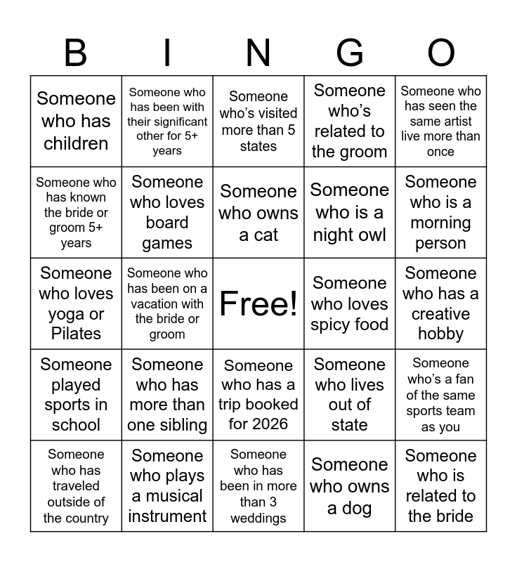 This bingo card has a free space and 24 words: Someone who has traveled outside of the country, Someone who has more than one sibling, Someone who owns a cat, Someone who owns a dog, Someone who has seen the same artist live more than once, Someone who has children, Someone who has been with their significant other for 5+ years, Someone who’s visited more than 5 states, Someone who loves spicy food, Someone who has a creative hobby, Someone who loves yoga or Pilates, Someone who loves board games, Someone who lives out of state, Someone who’s a fan of the same sports team as you, Someone who has known the bride or groom 5+ years, Someone who plays a musical instrument, Someone who has been in more than 3 weddings, Someone who’s related to the groom, Someone who is a morning person, Someone played sports in school, Someone who has been on a vacation with the bride or groom, Someone who has a trip booked for 2026, Someone who is a night owl and Someone who is related to the bride.