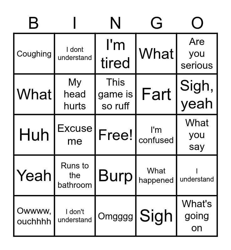 This bingo card has a free space and 29 words: Owwww, ouchhhh, What, Excuse me, Think so, Coughing, I'm tired, My head hurts, Runs to the bathroom, I'm confused, I don't understand, What you say, What's going on, Omgggg, Sigh, Sigh, yeah, Oh no, Burp, Yeah, Are you serious, Huh, What happened, Ooooo, Fart, What, What, I dont understand, I understand, This game is so ruff and Wait what.