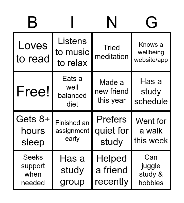 This bingo card has 16 words: Has a study group, Went for a walk this week, Tried meditation, Loves to read, Gets 8+ hours sleep, Listens to music to relax, Prefers quiet for study, Helped a friend recently, Free!, Eats a well balanced diet, Seeks support when needed, Knows a wellbeing website/app, Finished an assignment early, Has a study schedule, Made a new friend this year and Can juggle study & hobbies.