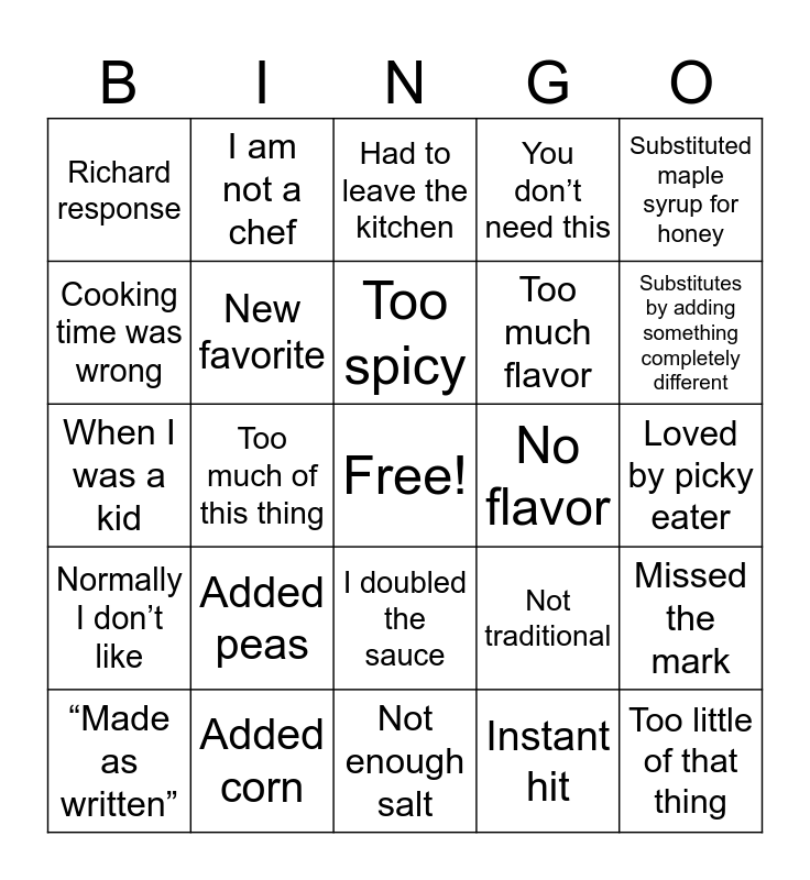 This bingo card has a free space and 24 words: Added peas, Added corn, Too spicy, “Made as written”, Substituted maple syrup for honey, Richard response, Cooking time was wrong, I am not a chef, No flavor, I doubled the sauce, Too much flavor, When I was a kid, Not traditional, Missed the mark, New favorite, Instant hit, Loved by picky eater, Had to leave the kitchen, Substitutes by adding something completely different, Too much of this thing, Too little of that thing, Normally I don’t like, You don’t need this and Not enough salt.