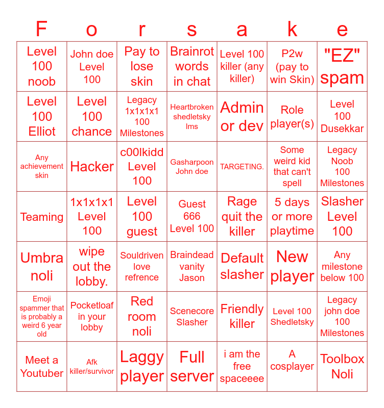 This bingo card has a free space and 48 words: Friendly killer, Role player(s), Full server, 1x1x1x1 Level 100, c00lkidd Level 100, Slasher Level 100, John doe Level 100, Afk killer/survivor, P2w (pay to win Skin), Braindead vanity Jason, "EZ" spam, Brainrot words in chat, Some weird kid that can't spell, TARGETING., Emoji spammer that is probably a weird 6 year old, 5 days or more playtime, Level 100 Elliot, Level 100 Dusekkar, Level 100 Shedletsky, Level 100 killer (any killer), Admin or dev, Level 100 guest, Level 100 noob, Level 100 chance, Legacy john doe 100 Milestones, Legacy 1x1x1x1 100 Milestones, Legacy Noob 100 Milestones, Meet a Youtuber, Gasharpoon John doe, Hacker, A cosplayer, Rage quit the killer, Any milestone below 100, Pocketloaf in your lobby, Teaming, Default slasher, New player, Any achievement skin, Souldriven love refrence, Red room noli, Umbra noli, Toolbox Noli, Pay to lose skin, Laggy player, Heartbroken shedletsky lms, Scenecore Slasher, wipe out the lobby. and i am the free spaceeee.