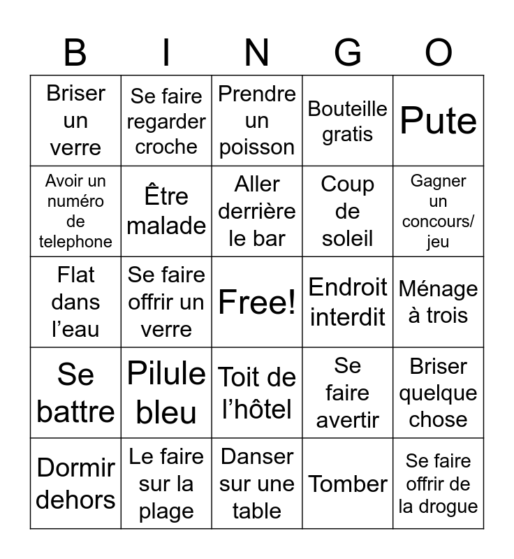 This bingo card has a free space and 24 words: Pilule bleu, Le faire sur la plage, Aller derrière le bar, Dormir dehors, Pute, Briser un verre, Avoir un numéro de telephone, Se faire regarder croche, Endroit interdit, Toit de l’hôtel, Coup de soleil, Flat dans l’eau, Se faire avertir, Briser quelque chose, Être malade, Tomber, Ménage à trois, Prendre un poisson, Gagner un concours/ jeu, Se faire offrir un verre, Se faire offrir de la drogue, Se battre, Bouteille gratis and Danser sur une table.