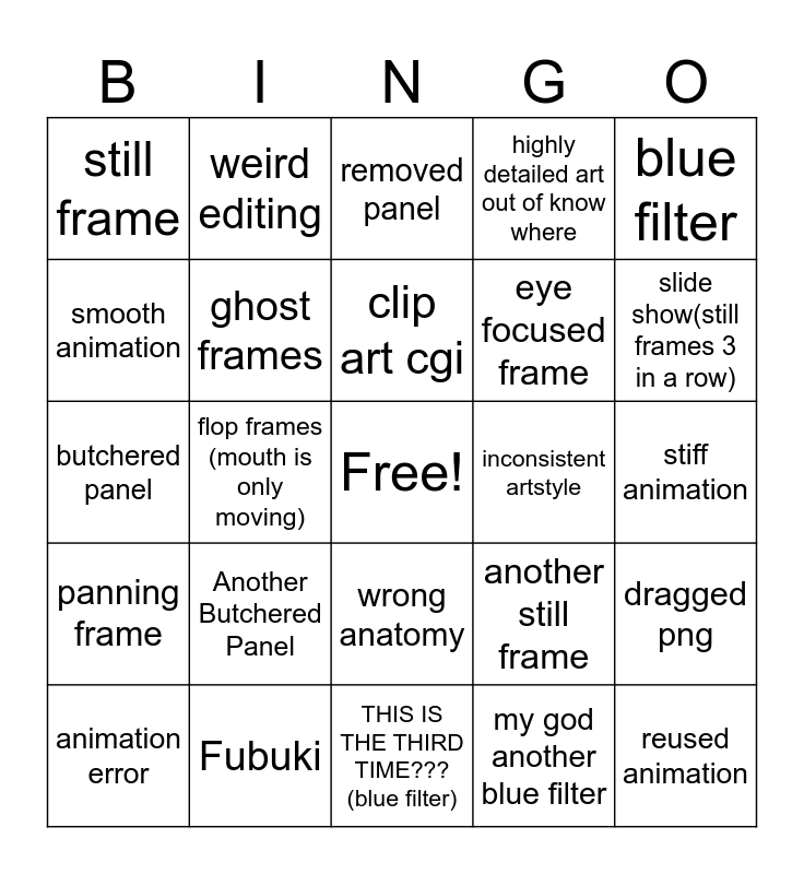 This bingo card has a free space and 24 words: Another Butchered Panel, Fubuki, clip art cgi, animation error, blue filter, still frame, smooth animation, weird editing, inconsistent artstyle, wrong anatomy, eye focused frame, butchered panel, another still frame, dragged png, ghost frames, my god another blue filter, stiff animation, removed panel, slide show(still frames 3 in a row), flop frames (mouth is only moving), reused animation, panning frame, highly detailed art out of know where and THIS IS THE THIRD TIME??? (blue filter).