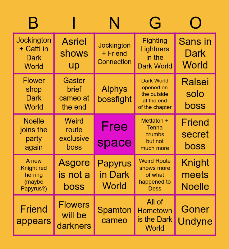 This bingo card has a free space and 24 words: Asgore is not a boss, Flowers will be darkners, Alphys bossfight, Friend appears, Sans in Dark World, Jockington + Catti in Dark World, Flower shop Dark World, Asriel shows up, Mettaton + Tenna crumbs but not much more, Papyrus in Dark World, Dark World opened on the outside at the end of the chapter, Noelle joins the party again, Weird Route shows more of what happened to Dess, Knight meets Noelle, Gaster brief cameo at the end, All of Hometown is the Dark World, Friend secret boss, Jockington + Friend Connection, Ralsei solo boss, Weird route exclusive boss, Goner Undyne, A new Knight red herring (maybe Papyrus?), Fighting Lightners in the Dark World and Spamton cameo.