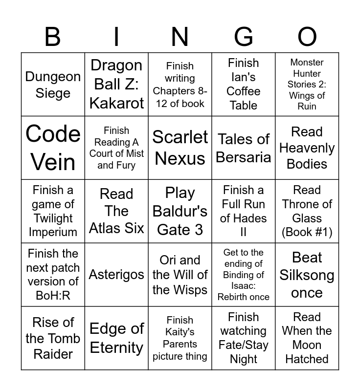 This bingo card has a free space and 24 words: Asterigos, Edge of Eternity, Scarlet Nexus, Rise of the Tomb Raider, Monster Hunter Stories 2: Wings of Ruin, Dungeon Siege, Code Vein, Dragon Ball Z: Kakarot, Finish a Full Run of Hades II, Ori and the Will of the Wisps, Tales of Bersaria, Finish a game of Twilight Imperium, Get to the ending of Binding of Isaac: Rebirth once, Beat Silksong once, Finish Reading A Court of Mist and Fury, Finish watching Fate/Stay Night, Read Throne of Glass (Book #1), Finish writing Chapters 8-12 of book, Read Heavenly Bodies, Read The Atlas Six, Read When the Moon Hatched, Finish the next patch version of BoH:R, Finish Ian's Coffee Table and Finish Kaity's Parents picture thing.