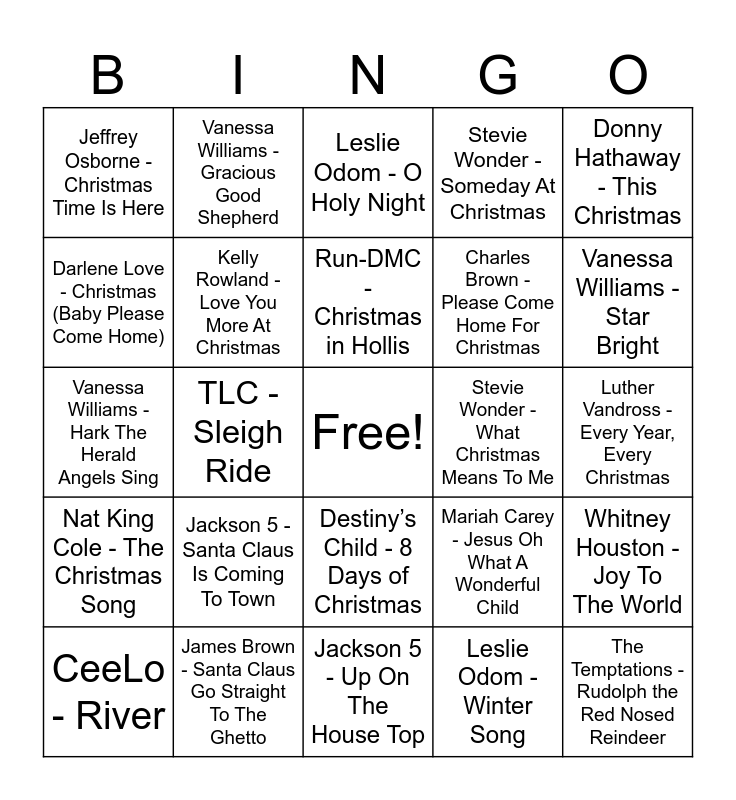 This bingo card has a free space and 45 words: The Temptations - The Little Drummer Boy, The Temptations - Rudolph the Red Nosed Reindeer, CeeLo - Mary, Did You Know?, CeeLo - River, CeeLo - Baby, It’s Cold Outside, Leslie Odom - Winter Song, Leslie Odom - O Holy Night, Leslie Odom - Ave Maria, Donny Hathaway - This Christmas, James Brown - Santa Claus Go Straight To The Ghetto, Stevie Wonder - Someday At Christmas, Stevie Wonder - What Christmas Means To Me, Destiny’s Child - 8 Days of Christmas, Jackson 5 - Santa Claus Is Coming To Town, Jackson 5 - Frosty The Snowman, Jackson 5 - Up On The House Top, Jackson 5 - I Saw Mommy Kissing Santa Claus, Vanessa Williams - Hark The Herald Angels Sing, Vanessa Williams - Do You Hear What I Hear?, Vanessa Williams - Star Bright, Vanessa Williams - Gracious Good Shepherd, Vanessa Williams - I Wonder As I Wander, Jeffrey Osborne - First Noel, Jeffrey Osborne - Christmas Time Is Here, Luther Vandross - My Favorite Things, Luther Vandross - Every Year, Every Christmas, Mariah Carey - Silent Night, Mariah Carey - All I Want For Christmas Is You, Mariah Carey - Jesus Oh What A Wonderful Child, Nat King Cole - The Christmas Song, Nat King Cole - O Come All Ye Faithful, Whitney Houston - Joy To The World, Whitney Houston - A King, Eartha Kitt - Santa Baby, Otis Redding - Merry Christmas Baby, TLC - Sleigh Ride, Ashanti - It’s Christmas Time Again, Tyrese - Sweet Little Jesus Boy, Boyz II Men - Let It Snow, Run-DMC - Christmas in Hollis, Darlene Love - Christmas (Baby Please Come Home), Charles Brown - Please Come Home For Christmas, Chuck Berry - Run Rudolph Run, Kelly Rowland - Love You More At Christmas and Adrienne Houghton - Feliz Navidad.