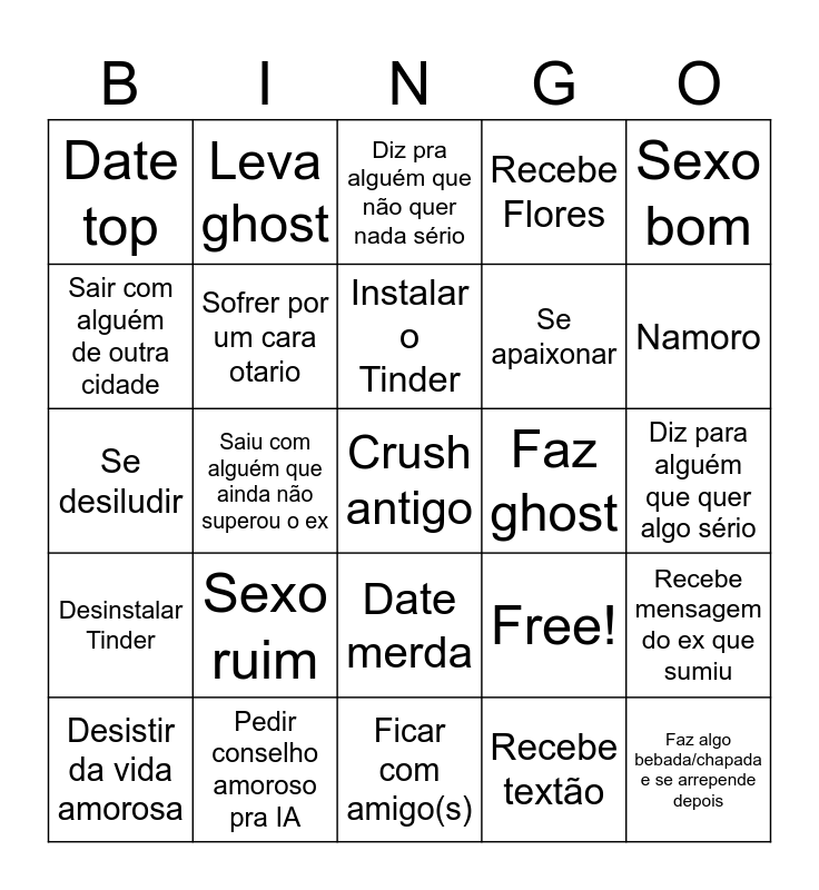 This bingo card has 25 words: Sexo ruim, Ficar com amigo(s), Instalar o Tinder, Desistir da vida amorosa, Sexo bom, Date top, Sair com alguém de outra cidade, Leva ghost, Faz ghost, Date merda, Se apaixonar, Se desiludir, Free!, Recebe mensagem do ex que sumiu, Sofrer por um cara otario, Faz algo bebada/chapada e se arrepende depois, Diz para alguém que quer algo sério, Diz pra alguém que não quer nada sério, Namoro, Saiu com alguém que ainda não superou o ex, Crush antigo, Pedir conselho amoroso pra IA, Desinstalar Tinder, Recebe Flores and Recebe textão.