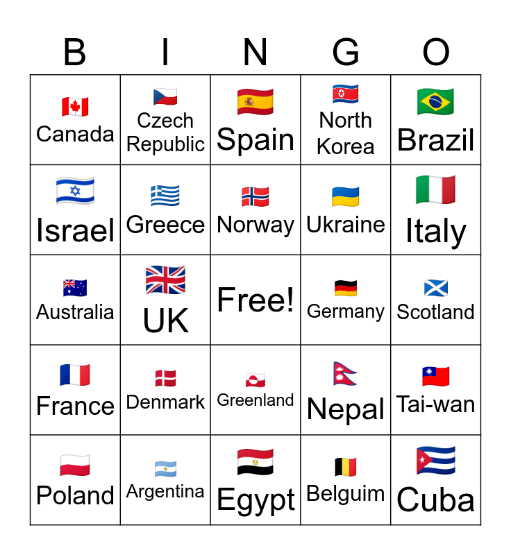 This bingo card has a free space and 35 words: đŻđľ Japan, đşđ¸ USA, đŚđś Antarctica, đŹđˇ Greece, đŹđą Greenland, đ°đľ North Korea, đŽđą Israel, đŽđŞ Ireland, đ¸đŻ Norway, đšđˇ Turkey, đŚđş Australia, đ§đˇ Brazil, đ¨đ Switzerland, đ¨đł China, đ¨đŚ Canada, đŠđŞ Germany, đ§đŞ Belguim, đŹđ§ UK, đŤđˇ France, đ¨đş Cuba, đłđľ Nepal, đľđą Poland, đšđź Tai-wan, đŚđˇ Argentina, đŞđŚ Spain, đŽđš Italy, đ˛đ˝ Mexico, đˇđş Russia, đşđŚ Ukraine, đ´ó §ó ˘ó łó Łó ´ó ż Scotland, đ´ó §ó ˘ó Ľó Žó §ó ż England, đŞđŹ Egypt, đŠđ° Denmark, đ¨đż Czech Republic and đ˛đŹ Madagascar.