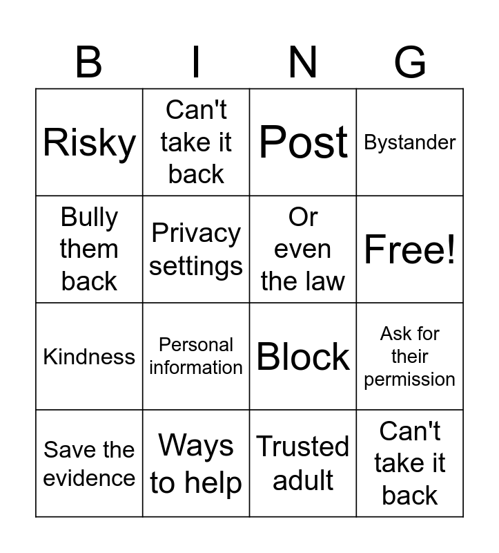 This bingo card has 17 words: Trusted adult, Save the evidence, Post, Risky, Personal information, Bystander, Ask for their permission, Or even the law, Free!, Privacy settings, Ways to help, Block, Bully them back, Can't take it back, Kindness, Rumor and Can't take it back.