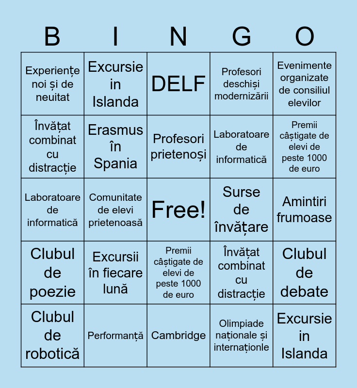 This bingo card has 1 images, a free space and 37 words: Bacalaureat francofon, Concursuri internaționale, Erasmus în Spania, Clubul de debate, Excursii în fiecare lună, Profesori prietenoși, Cambridge, Evenimente organizate de consiliul elevilor, Laboratoare de informatică, Comunitate de elevi prietenoasă, Profesori deschiși modernizării, Excursie in Islanda, Amintiri frumoase, Învățat combinat cu distracție, Clubul de poezie, Limbi străine, DELF, Olimpiade naționale și internaționle, Surse de învățare, Experiențe noi și de neuitat, Performanță, Premii câștigate de elevi de peste 1000 de euro, Clubul de robotică, Profesori deschiși modernizări, Cambridge, Limbi străine, Bacalaureat francofon, Erasmus în Spania, Clubul de robotică, DELF, Premii câștigate de elevi de peste 1000 de euro, Olimpiade naționale și internaționle, Excursie in Islanda, Evenimente organizate de consiliul elevilor, Învățat combinat cu distracție, Laboratoare de informatică and Erasmus în Spania.
