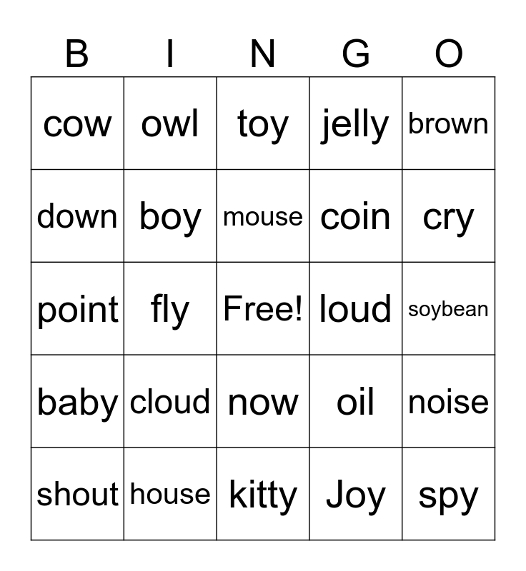 This bingo card has a free space and 24 words: cloud, house, mouse, shout, brown, cow, down, owl, loud, now, coin, point, oil, noise, boy, Joy, soybean, toy, cry, fly, spy, baby, jelly and kitty.