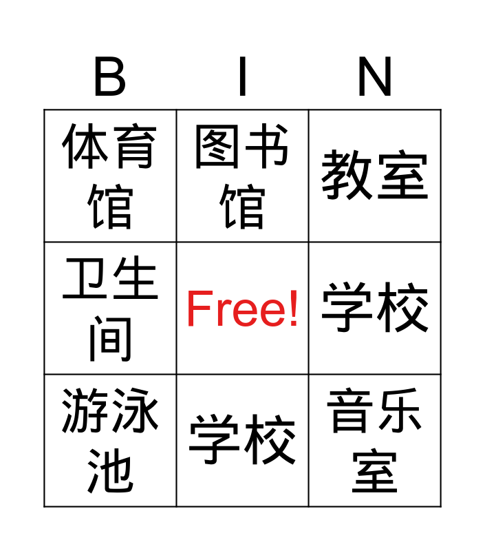 This bingo card has a free space and 8 words: 学校, 教室, 图书馆, 游泳池, 体育馆, 音乐室, 卫生间 and 学校.