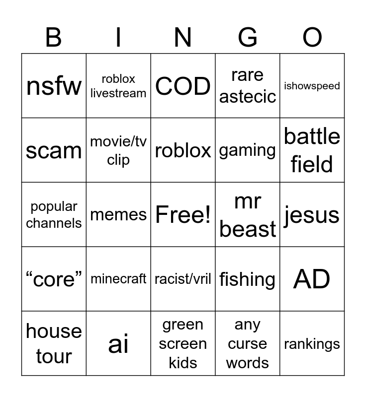 This bingo card has a free space and 24 words: minecraft, ai, roblox, house tour, ishowspeed, nsfw, scam, roblox livestream, mr beast, racist/vril, gaming, popular channels, fishing, AD, movie/tv clip, any curse words, jesus, COD, battle field, memes, rankings, “core”, rare astecic and green screen kids.