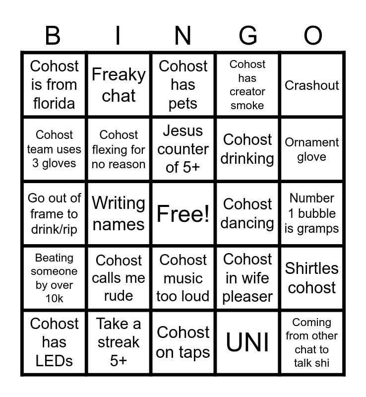 This bingo card has a free space and 24 words: Cohost calls me rude, Take a streak 5+, Jesus counter of 5+, Cohost has LEDs, Crashout, Cohost is from florida, Cohost team uses 3 gloves, Freaky chat, Cohost dancing, Cohost music too loud, Cohost drinking, Go out of frame to drink/rip, Cohost in wife pleaser, Shirtles cohost, Cohost flexing for no reason, UNI, Number 1 bubble is gramps, Cohost has pets, Ornament glove, Writing names, Coming from other chat to talk shi, Beating someone by over 10k, Cohost has creator smoke and Cohost on taps.