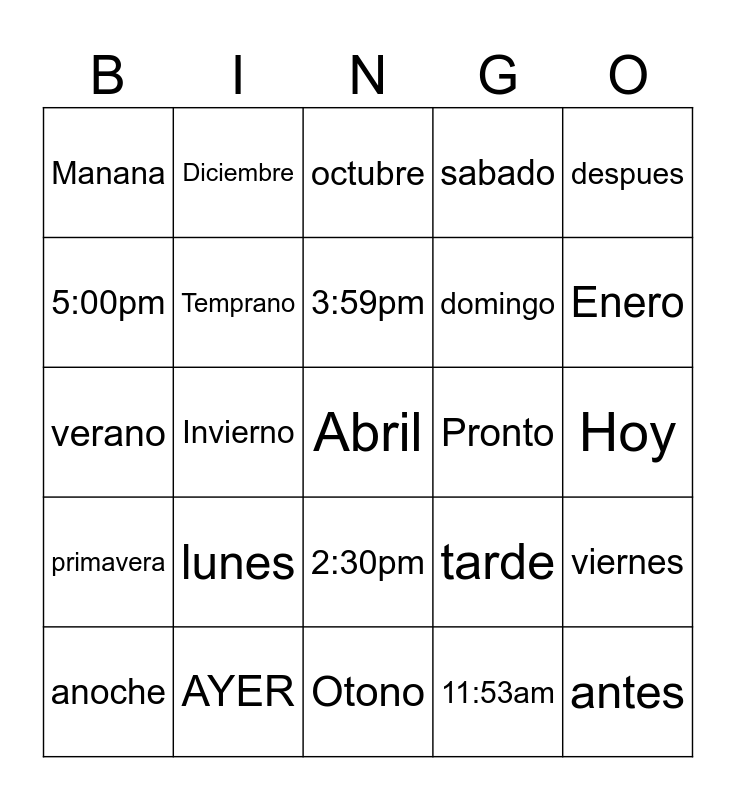 This bingo card has 30 words: AYER, 10:00pm, Invierno, Marzo, Manana, octubre, Temprano, 2:30pm, Pronto, Otono, Hoy, Abril, 11:53am, antes, Enero, 3:30pm, tarde, primavera, lunes, despues, verano, 10:00am, Diciembre, domingo, 5:00pm, sabado, viernes, anoche, 3:59pm and septiembre.