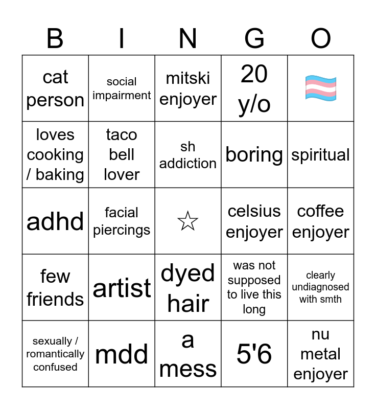 This bingo card has a free space and 24 words: artist, mdd, sh addiction, sexually / romantically confused, 🏳️⚧️, cat person, loves cooking / baking, social impairment, celsius enjoyer, dyed hair, boring, adhd, was not supposed to live this long, clearly undiagnosed with smth, taco bell lover, 5'6, coffee enjoyer, mitski enjoyer, spiritual, facial piercings, nu metal enjoyer, few friends, 20 y/o and a mess.