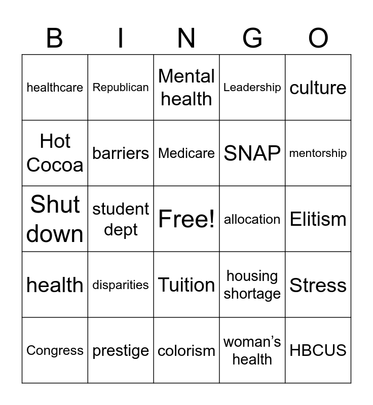 This bingo card has a free space and 30 words: prestige, hierarchy, student dept, FAFSA, healthcare, Mental health, barriers, Tuition, allocation, colorism, Elitism, HBCUS, woman’s health, inequality, mentorship, gaps, housing shortage, health, disparities, culture, Shut down, Democratic, Republican, SNAP, Hot Cocoa, Leadership, Stress, Congress, Medicare and Funding.