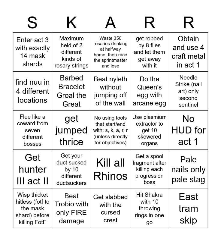 This bingo card has a free space and 24 words: Get your duct sucked by 10 different ductsuckers, Beat Trobio with only FIRE damage, Beat nyleth without jumping off of the wall, Wisp thicket hitless (fotf to the mask shard) before killing FotF, Obtain and use 4 craft metal in act 1, Enter act 3 with exactly 14 mask shards, find nuu in 4 different locations, Maximum held of 2 different kinds of rosary strings, Use plasmium extractor to get 10 skewered organs, Kill all Rhinos, Do the Queen's egg with arcane egg, Flee like a coward from seven different bosses, Get a spool fragment after killing each progression boss, Pale nails only pale stag, Barbed Bracelet Groal the Great, Hit Shakra with 10 throwing rings in one go, No HUD for act 1, Waste 350 rosaries drinking at halfway home, then race the sprintmaster and lose, Needle Strike (nail art) only second sentinel, get jumped thrice, East tram skip, Get hunter III act II, get robbed by 8 flies and let them get away with it and Get slabbed with the cursed crest.